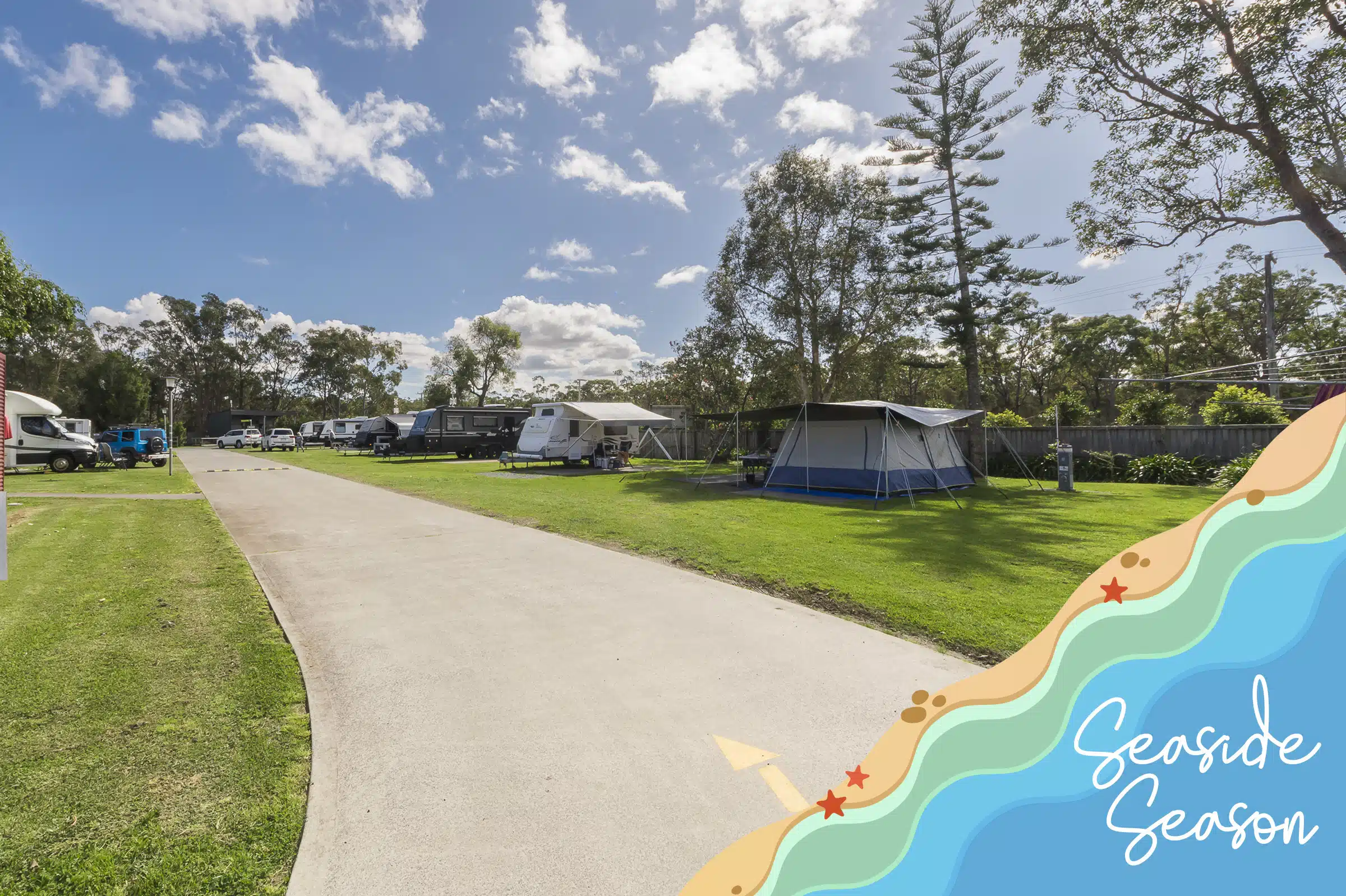 Set up your caravan, RV, camper or tent on one of our large grassy sites. Each site has a concrete slab, powerhead, fresh water tap and grey water disposal. Choose from powered slab sites or unpowered slab sites with the option of private ensuite hire. Drive-through sites are also available. All sites are pet friendly.