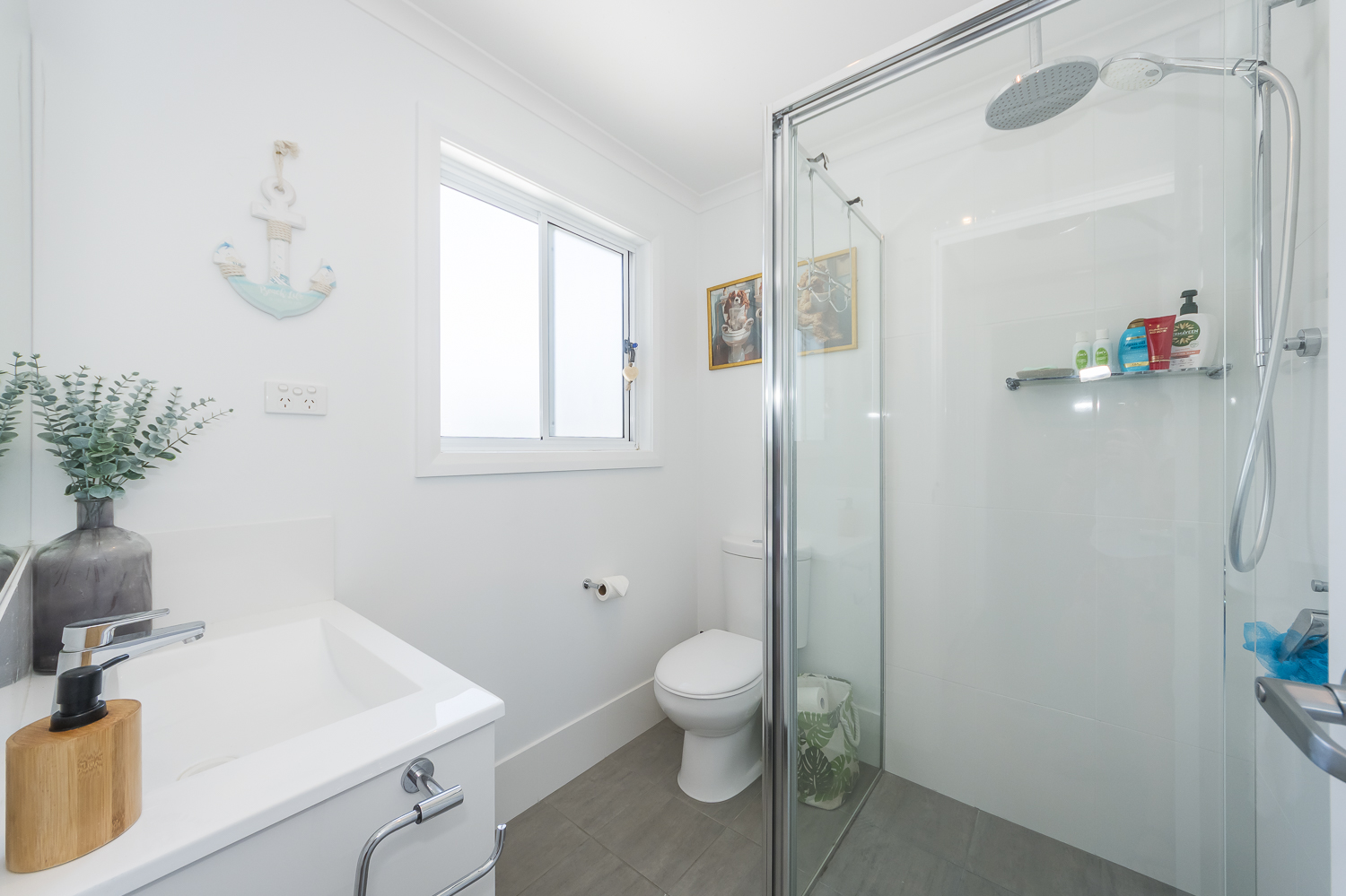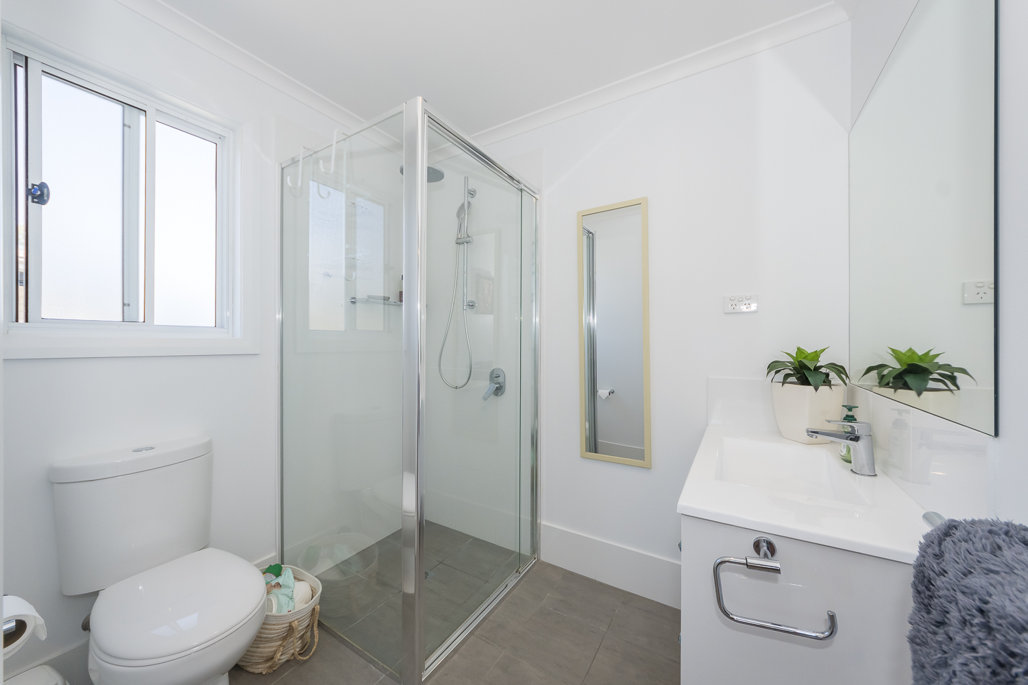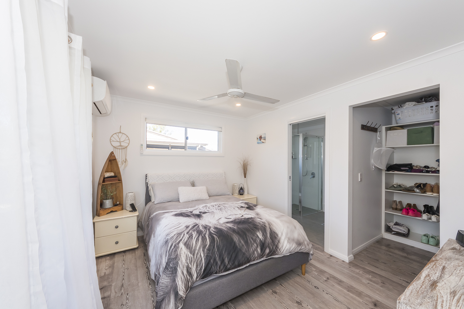 The design of the home features one spacious carpeted bedroom, with a built-in robe and ensuite bathroom, which has a large shower, toilet and vanity. A second toilet is located within the laundry. The laundry has storage for brooms.